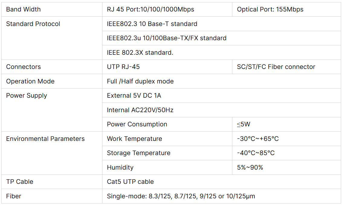 The non-managed media converters, which give you economic solutions for media conversion between fiber and copper Ethernet. It provides you SC,FC or ST connectors for your fiber optic cables and RJ45 for twisted pair UTP cable connection.The maximum