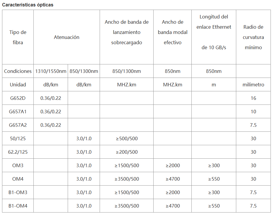 Tipo de fibra: fibra monomodo G.652D, G.657A1 o G.657A2 y fibra de molde múltiple OM1, OM2, OM3, OM4.