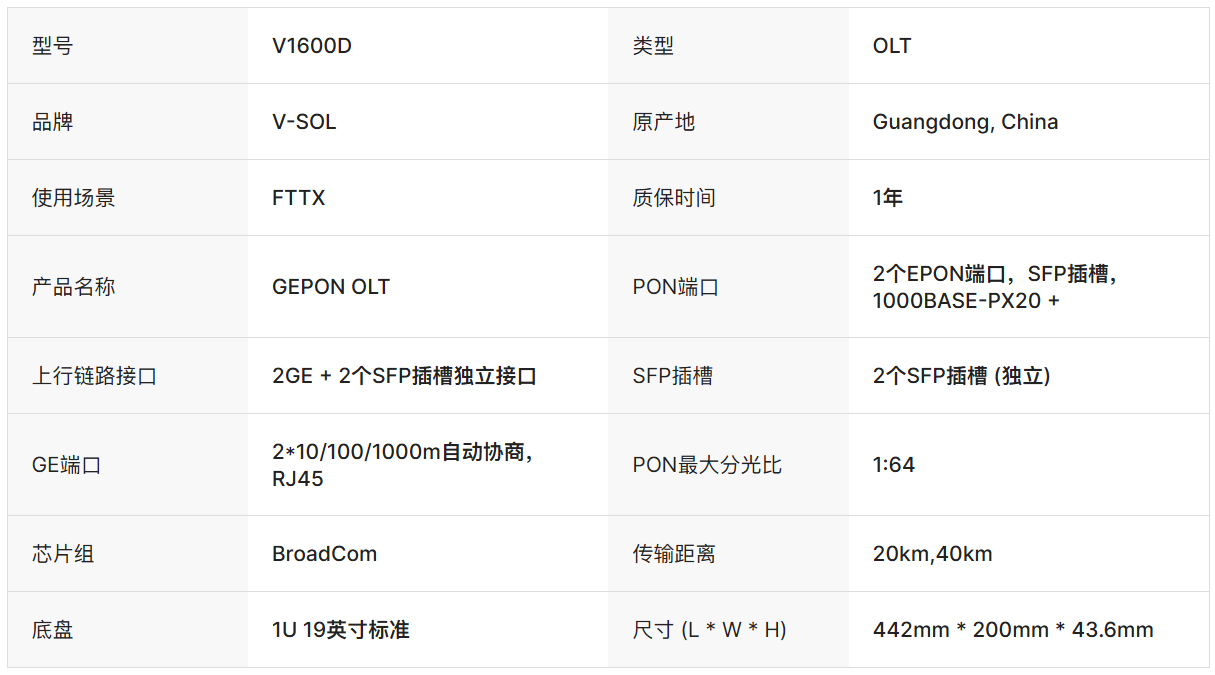 V-Sol OLT V1600D 2GE + 2 SFP插槽独立接口2*10/100/1000M自动协商RJ45光纤网络设备
