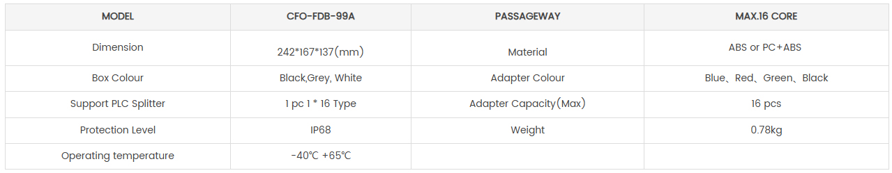 The Fiber Optic Distribution Box is a kind of wall-mounted optical fiber termination box with IP68 protection level and metal material, which is mainly used in FTTH, FTTB, FTTC, and FTTA applications. This fiber optic termination box is designed to provide a high level of protection for fiber optic splicing and distribution. It is engineered to protect fiber optic splices from dust, water, and other contaminants, and to provide secure and organized storage for fiber optic cables. The metal material and IP68 protection level ensure better performance and greater durability. This fiber optic distribution box is a perfect choice for FTTH, FTTB, FTTC, and FTTA applications. Pre-connected technology Plug and play.Moisture-proof, waterproof, dust-proof, anti-aging.Protection level up to IP68.