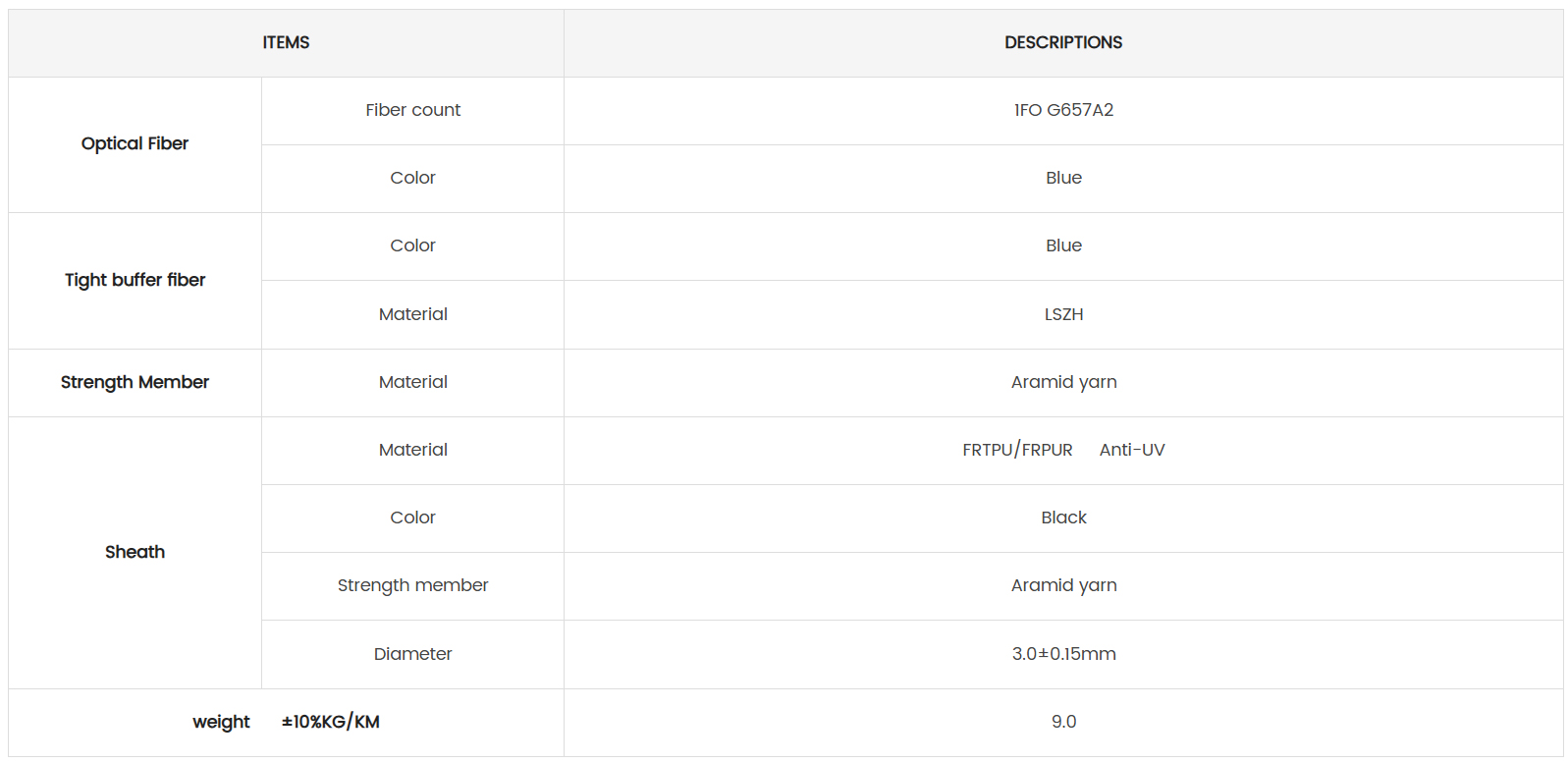 The fibers,250μm, are positioned in a loose tube made of high-modulus plastic. The tubes are filled with a water-resistant filling compound. The tube is covered with a spiral tube armored as a strength member. The cable is completed with an LSZH (LSZH, Low smoke, Zero halogen, Flame-retardant) material Jacket.