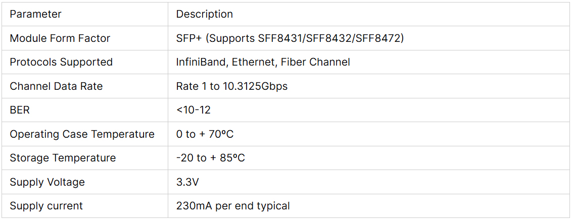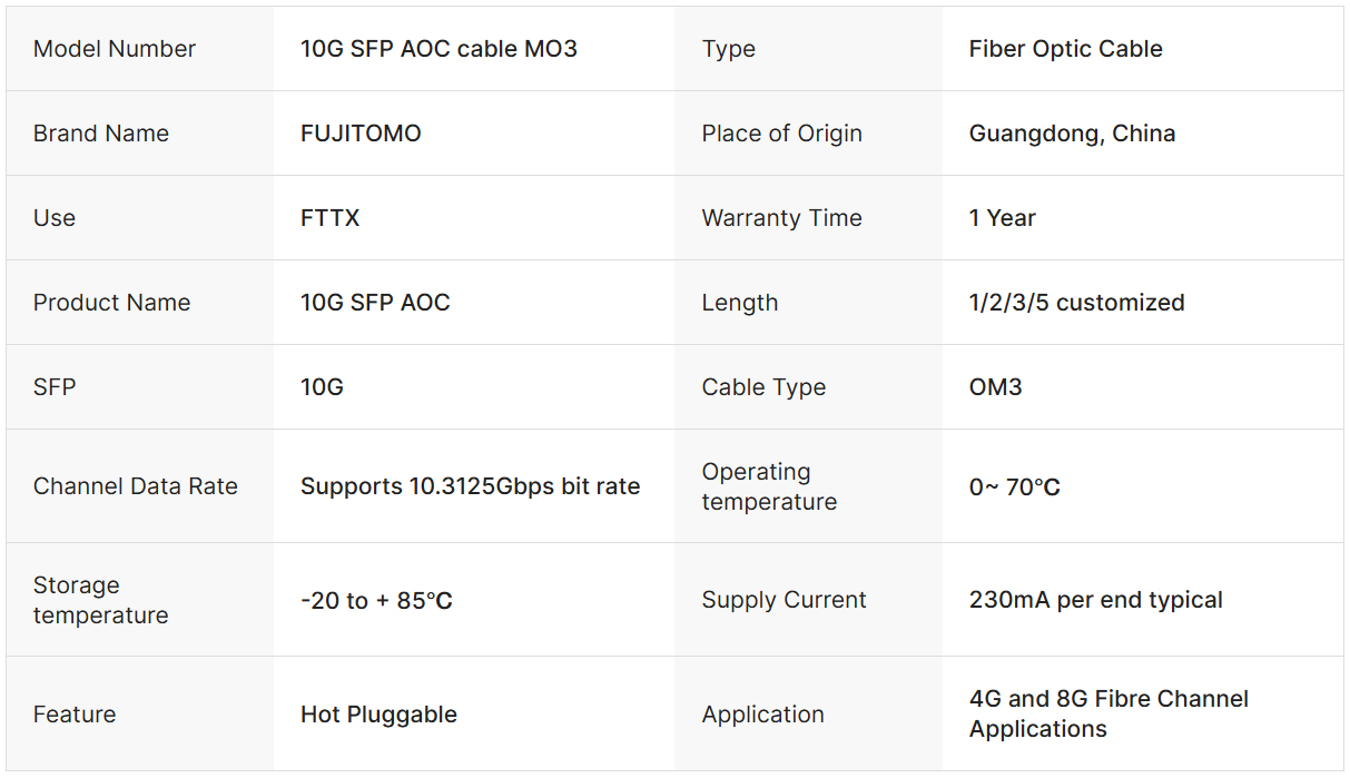 SFP+ Active Optical Cables are direct-attach fiber assemblies with SFP+ connectors.They are suitable for very short distances and offer a cost-effective way to connect within racks and across adjacent racks. FlyinFiberSFP+ Active Optical Cables’s length is up to 300 meters on OM3MMF 850nm 1-100m,