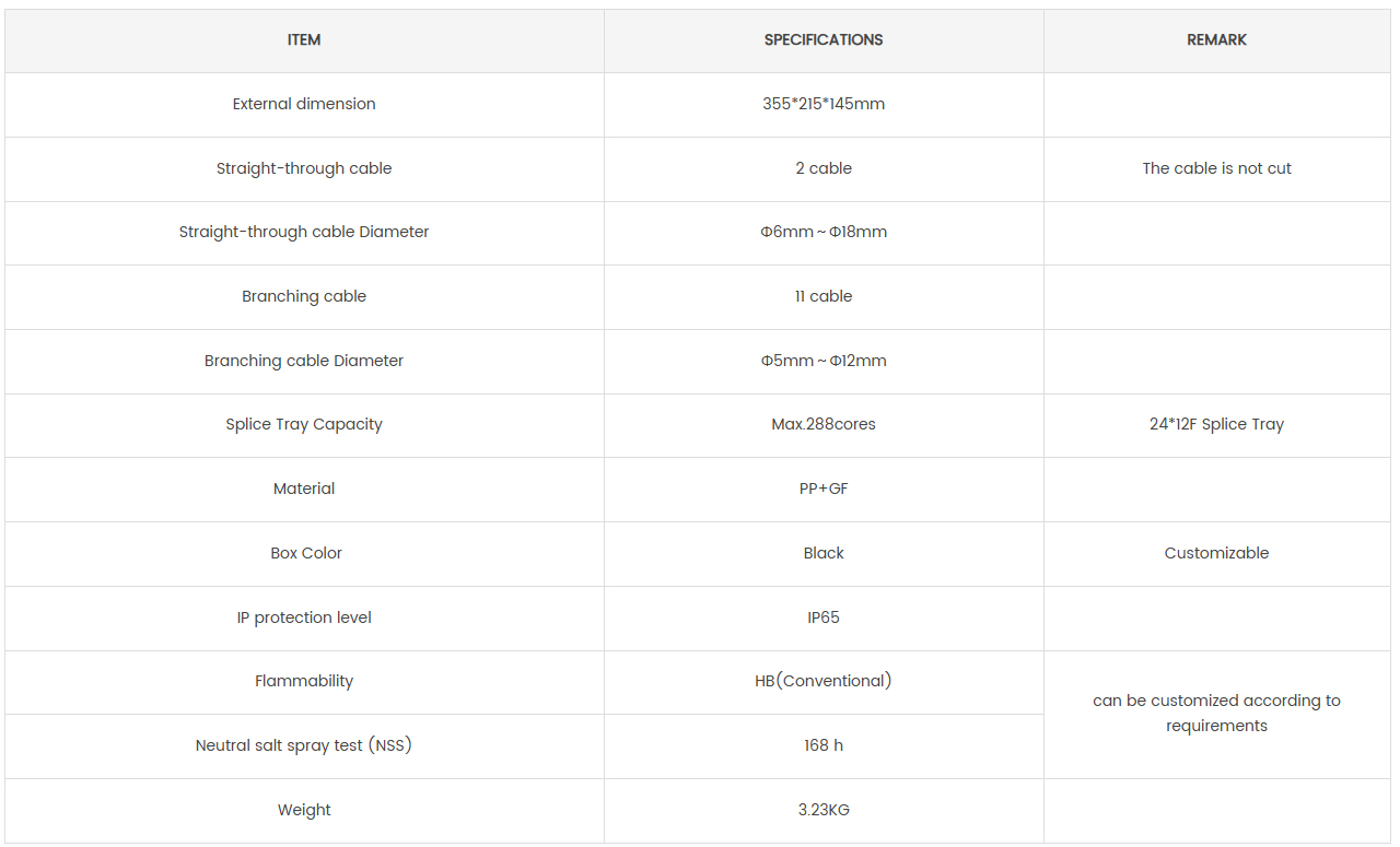 Black PP Material 192/288 Port Black Optical Cable Splice Box FTTH Distribution Box(288 core) Configuration: