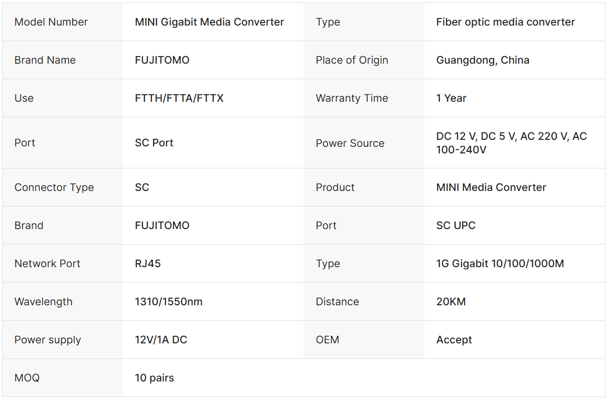 Feature highlights: The FUJITOMO MINI Media Converter supports 1G Gigabit speeds with 10/100/1000M compatibility, featuring an SC fiber port and RJ45 Ethernet for versatile network integration. It ensures reliable data transmission up to 20KM and operates on multiple power sources including AC 100-240V and DC 12V, offering flexibility in various environments.