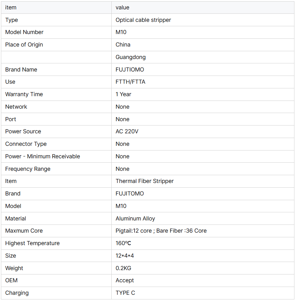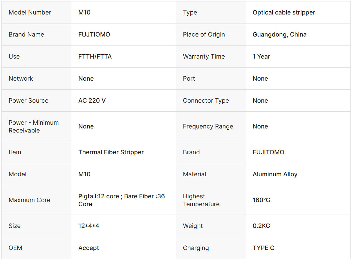 Feature highlights: The FUJITOMO M10 Electric Thermal Fiber Stripper is designed for efficient stripping of optical fiber cables, featuring a maximum core capacity of 12-core pigtails and 36-core bare fibers. Constructed from durable aluminum alloy, it ensures reliable performance with a highest temperature of 160℃. Its compact size of 12*4*4 and lightweight design at 0.2KG make it highly portable and easy to handle. The device supports TYPE C charging and is ideal for FTTH/FTTA applications.