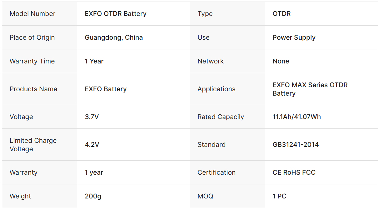Feature highlights: EXFO OTDR Battery designed for EXFO MAX Series, features a 3.7V voltage, 11.1Ah/41.07Wh rated capacity, and complies with GB31241-2014 standards. It ensures reliable power supply and is compact at just 200g.