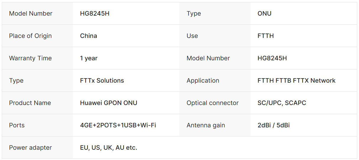 Feature highlights:Huawei HG8245H GPON ONU supports FTTH networks with 4GE, 2POTS, and Wi-Fi ports, featuring a PON interface class B+/PX20+ and Tx 1310nm, Rx 1490nm wavelength. It includes adaptive Ethernet ports, external antenna support, and wide power adapter compatibility for global use.