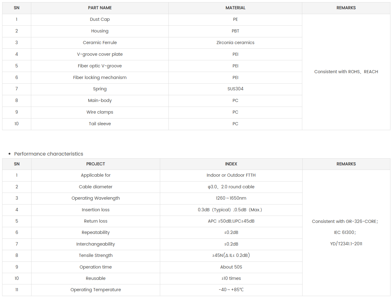 Pre-Polished Fiber Fast Connectors, Blue Field Installable Fiber Optic Connector Technical Specifications: