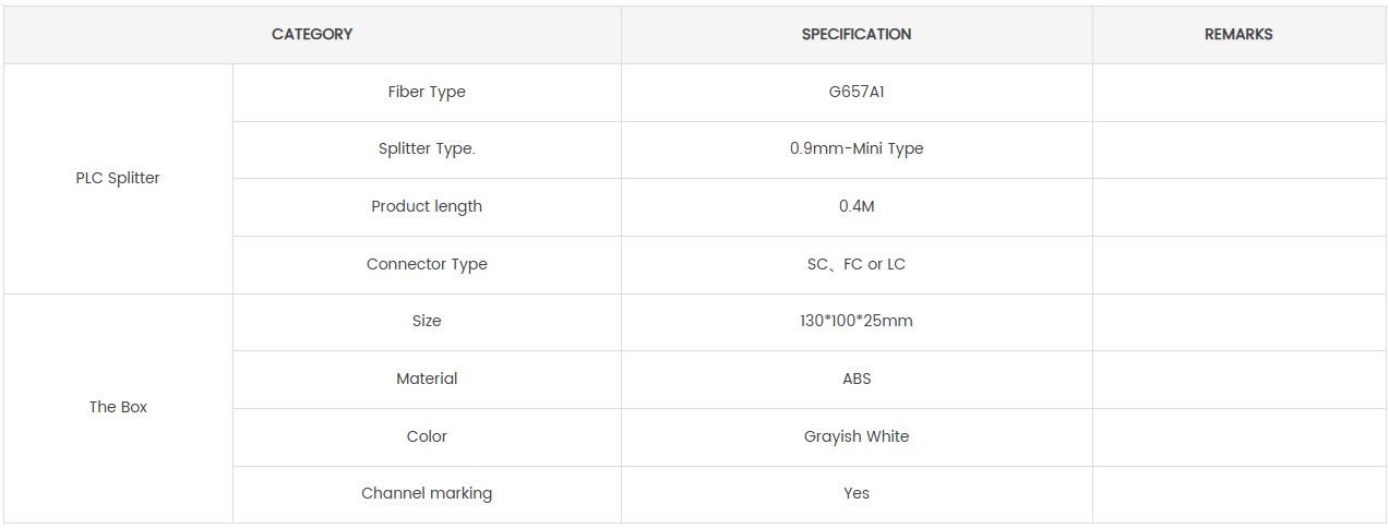 Planar Lightwave Circuit Splitter (PLC Splitter) is based on planar waveguide optical power distribution products, with low insertion loss and polarization-dependent loss, small size, wide operating wavelength range, high channel uniformity, and good characteristics, generally used in passive optical networks (EPON, BPON, GPON, etc.) to realize the optical power splitting. Our PLC splitters are compliant with Telcordia GR-1209-CORE, Telcordia GR-1221-CORE, YD/T 1117-2001, and RoHS standards.
