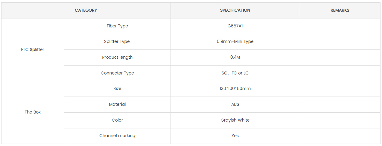 Planar Lightwave Circuit Splitter (PLC Splitter) is based on planar waveguide optical power distribution products, with low insertion loss and polarization-dependent loss, small size, wide operating wavelength range, high channel uniformity, and good characteristics, generally used in passive optical networks (EPON, BPON, GPON, etc.) to realize the optical power splitting. Our PLC splitters are compliant with Telcordia GR-1209-CORE, Telcordia GR-1221-CORE, YD/T 1117-2001, and RoHS standards.