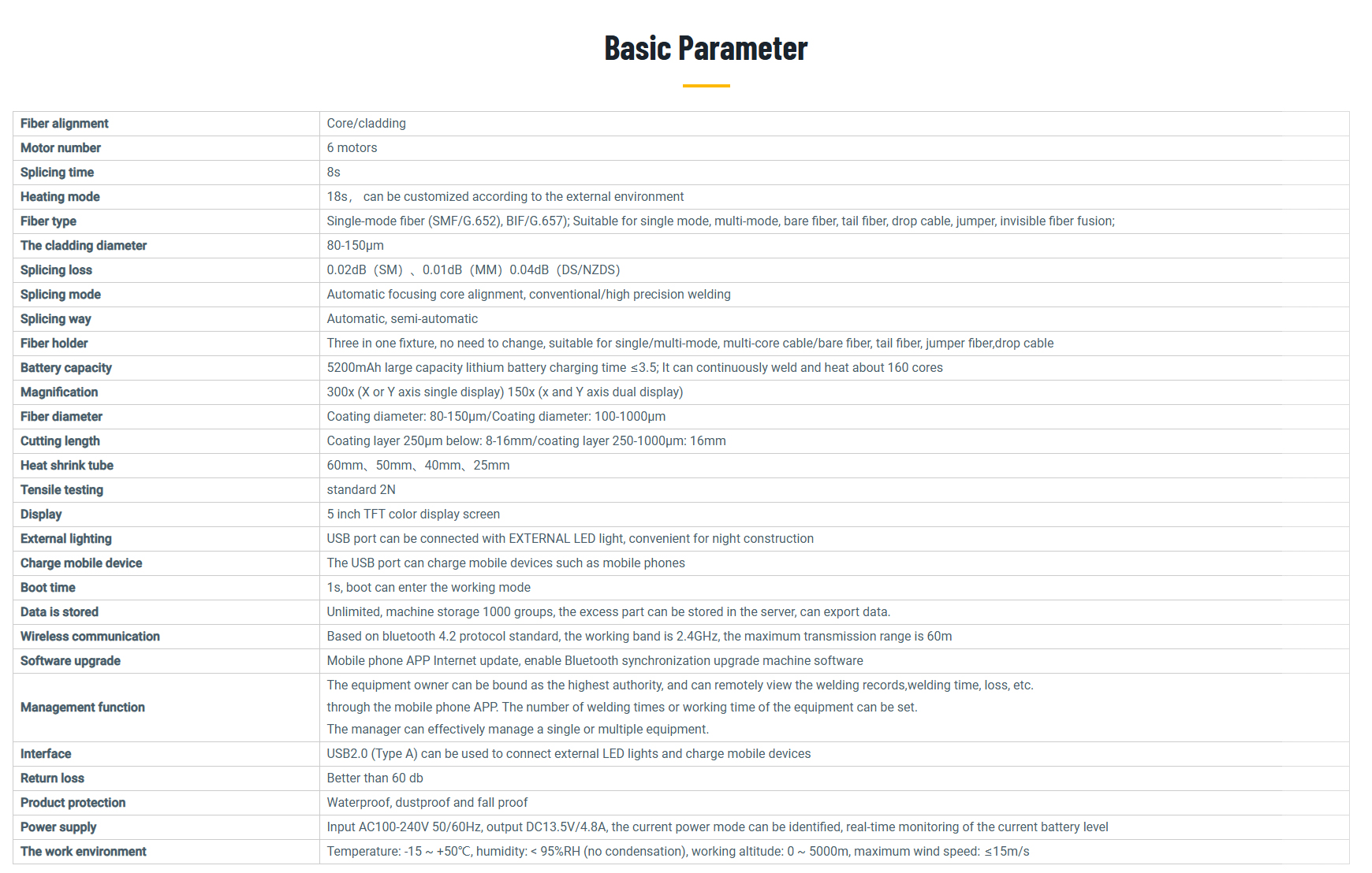 Signal Fire AI-5 is mainly suitable for security monitoring and other engineering projects. Adopting a 5-inch color screen, the operation graphics are simple and intuitive; Up to 320x focusing magnification, 8 second high-speed splicing, 18 second heating, with a 50% increase in work efficiency compared to ordinary fusion machines; The 5200mAh lithium battery can fuse and heat about 160 cells when fully charged. Its unique lighting design makes it convenient for night construction or emergency repairs.