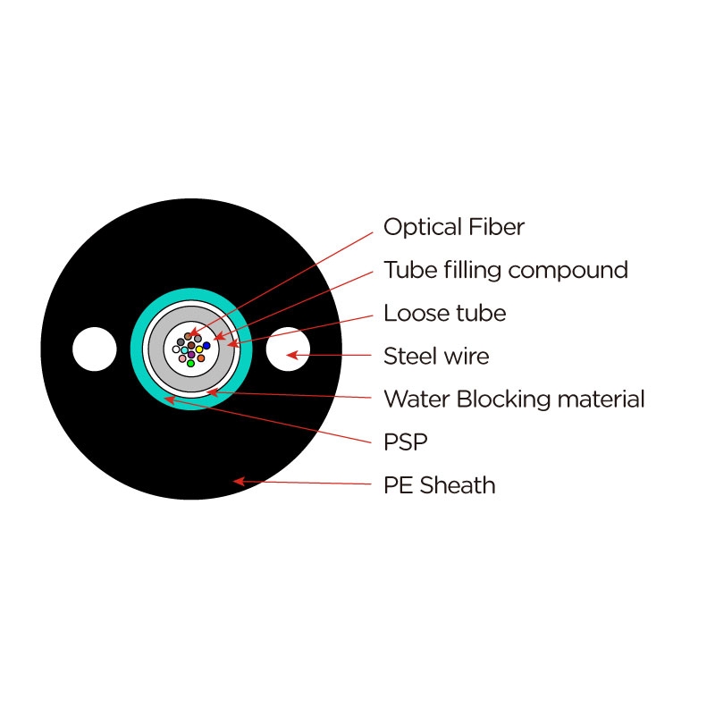 In the GYXTW cable, single-mode/multimode fibers are positioned in the loose tube, which is made of high-modulus plastic materials and filled with filling compounds. PSP is longitudinally applied around the loose tube, and water-blocking materials are distributed into interstices between them to guarantee compactness and longitudinal water-blocking performance. Two parallel steel wires are placed at both sides of the cable core while the PE sheath is extruded over it.