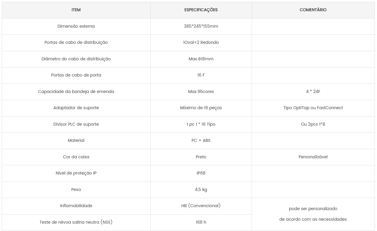 O fechamento de terminação de acesso de fibra é capaz de conter até 16 assinantes e 60 pontos de emenda como fechamento. Ele é usado como um fechamento de emenda e um ponto de terminação para o cabo de alimentação se conectar com o cabo drop no sistema de rede FTTx. Ele integra emenda de fibra, divisão, distribuição, armazenamento e conexões de cabos em uma caixa de proteção sólida.