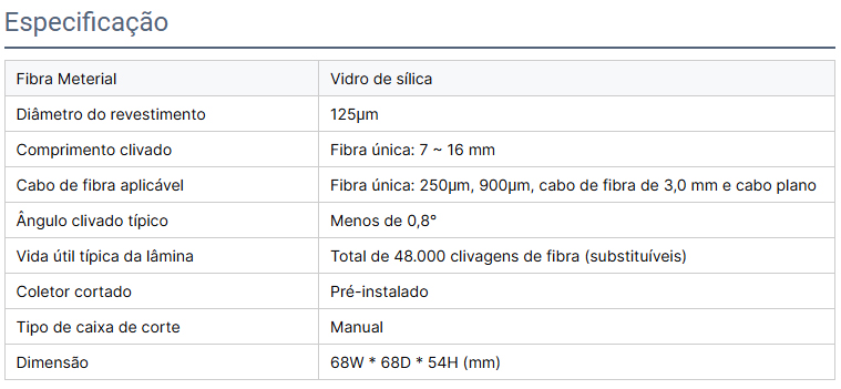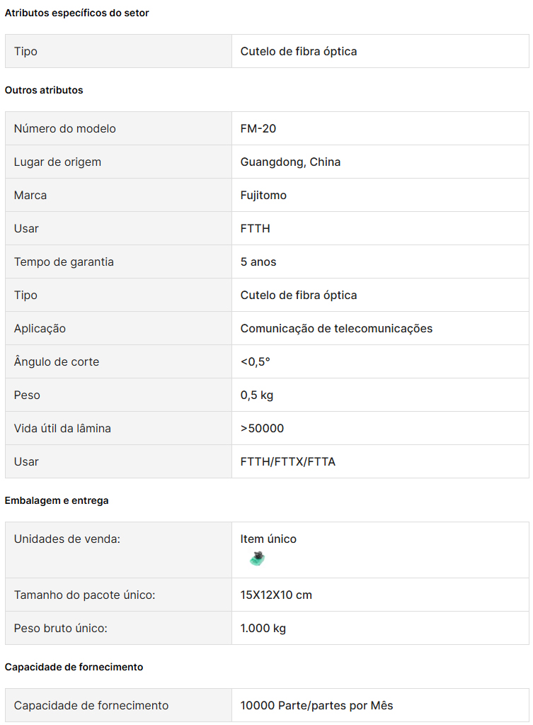 O cortador de fibra óptica Fujitomo FM-20 é processado por CNC de alta precisão, com forte resistência à corrosão e boa estabilidade; A lâmina é feita de aço de tungstênio real com tecnologia avançada e alta dureza, tornando a borda da lâmina extremamente afiada; O ângulo de corte ≤0,8 graus é usado para cortar a face final da fibra óptica suavemente. Ao mesmo tempo, a vida útil da lâmina pode chegar a 48000 vezes e é durável.