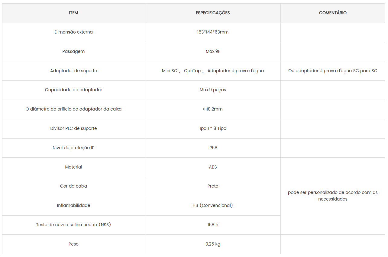 2. Unidades de metal ou plástico para armazenamento de cabos ópticos estão disponíveis.