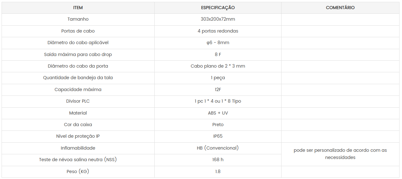 O equipamento é usado como um ponto de terminação para que o cabo de alimentação se conecte com o cabo drop no sistema de rede de comunicação FTTx. A emenda, divisão e distribuição de fibra podem ser feitas nesta caixa e, enquanto isso, fornece proteção e gerenciamento sólidos para a construção da rede FTTx
