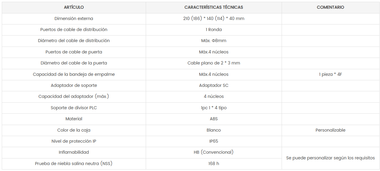 El equipo se utiliza como punto de terminación para que el cable de alimentación se conecte con el cable de bajada en el sistema de red de comunicación FTTx. El empalme, la división y la distribución de la fibra se pueden realizar en esta caja y, al mismo tiempo, proporciona una protección y una gestión sólidas para el edificio de la red FTTx.