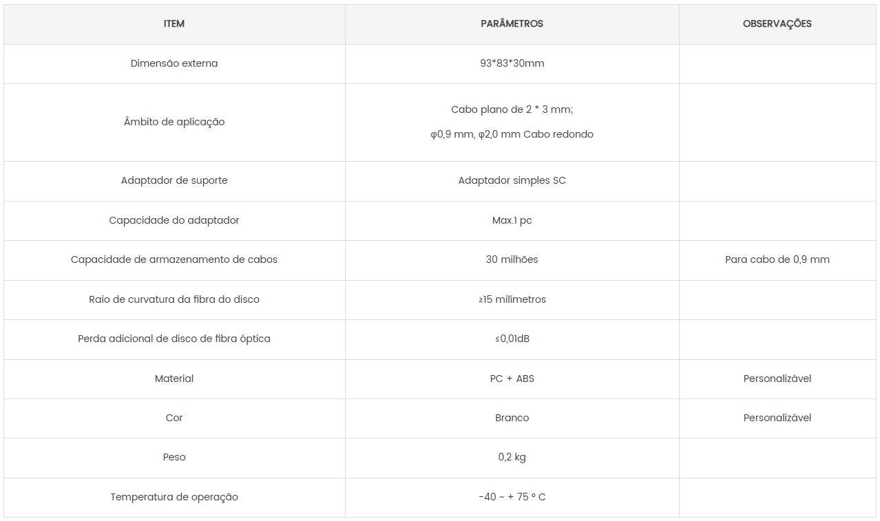 Este tipo de caixa de roseta de fibra pode conter 1 assinante. É usado como um ponto de terminação para que o cabo pendente se conecte com o cabo do remendo na aplicação interna de FTTH. Ele integra emenda de fibra, terminação, armazenamento e conexão de cabo em uma caixa de proteção sólida.
