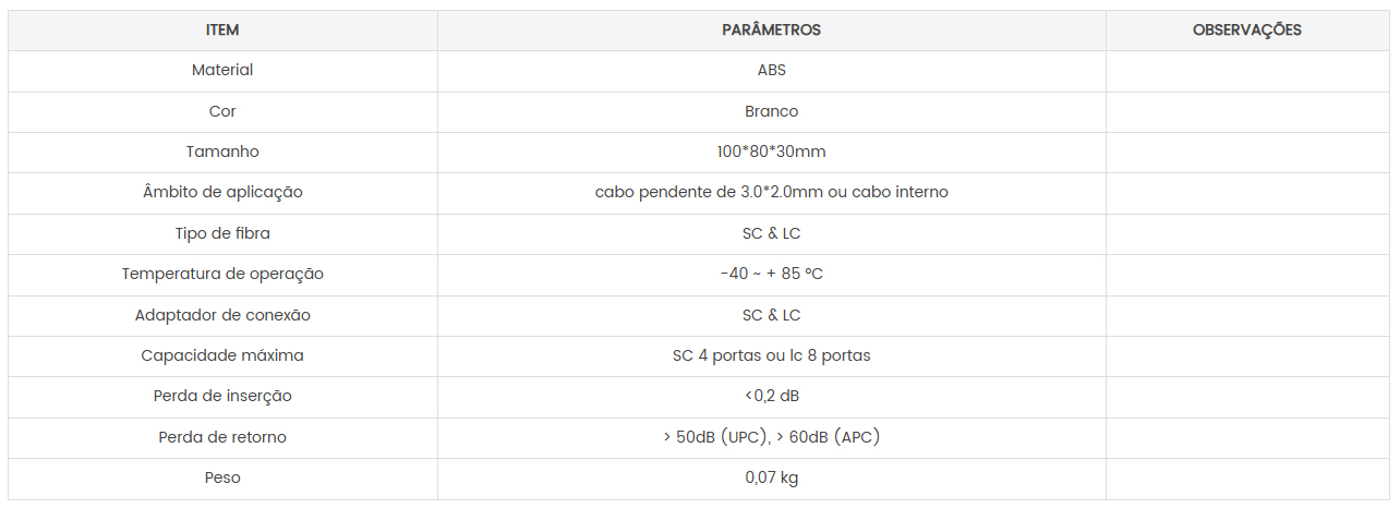 Este tipo de caixa de roseta de fibra pode conter até 4 assinantes. É usado como um ponto de terminação para que o cabo pendente se conecte com o cabo de remendo na aplicação interna de FTTH. Integra