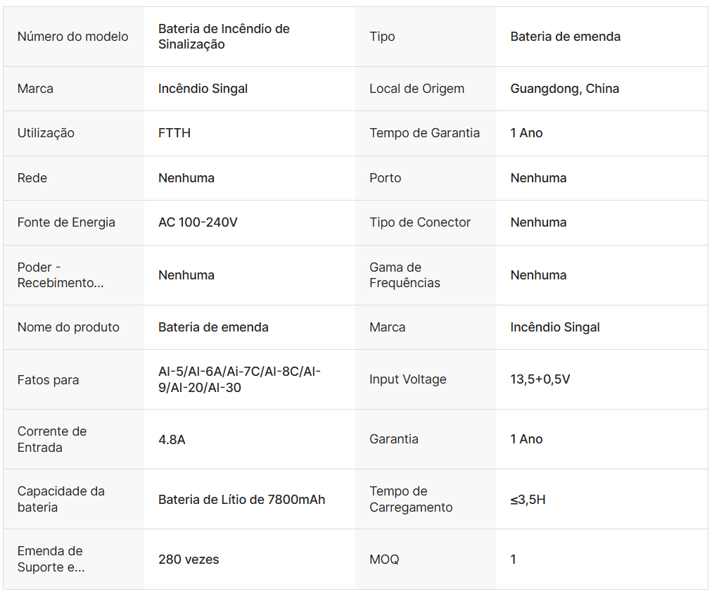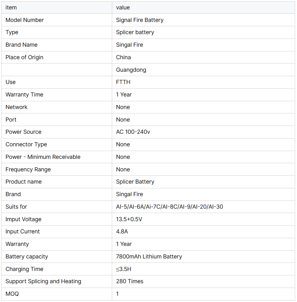 Destaques de longa-metragem: Esta bateria de emenda SignalFire é uma Bateria de lítio de 7800mAh concebido para máquinas de emenda AI-5C/AI-6A/AI-7C/AI-8/AI-9/AI-20/AI-30, suportando Até 280 ciclos de emenda e aquecimento. Com um tempo de carregamento de ≤3,5 horas e especificações de entrada de 13,5V ±0,5V, 4,8A, garante um desempenho fiável. Apoiada por uma garantia de 1 ano e adequada para aplicações FTTH, esta bateria garante durabilidade e entrega consistente de energia.