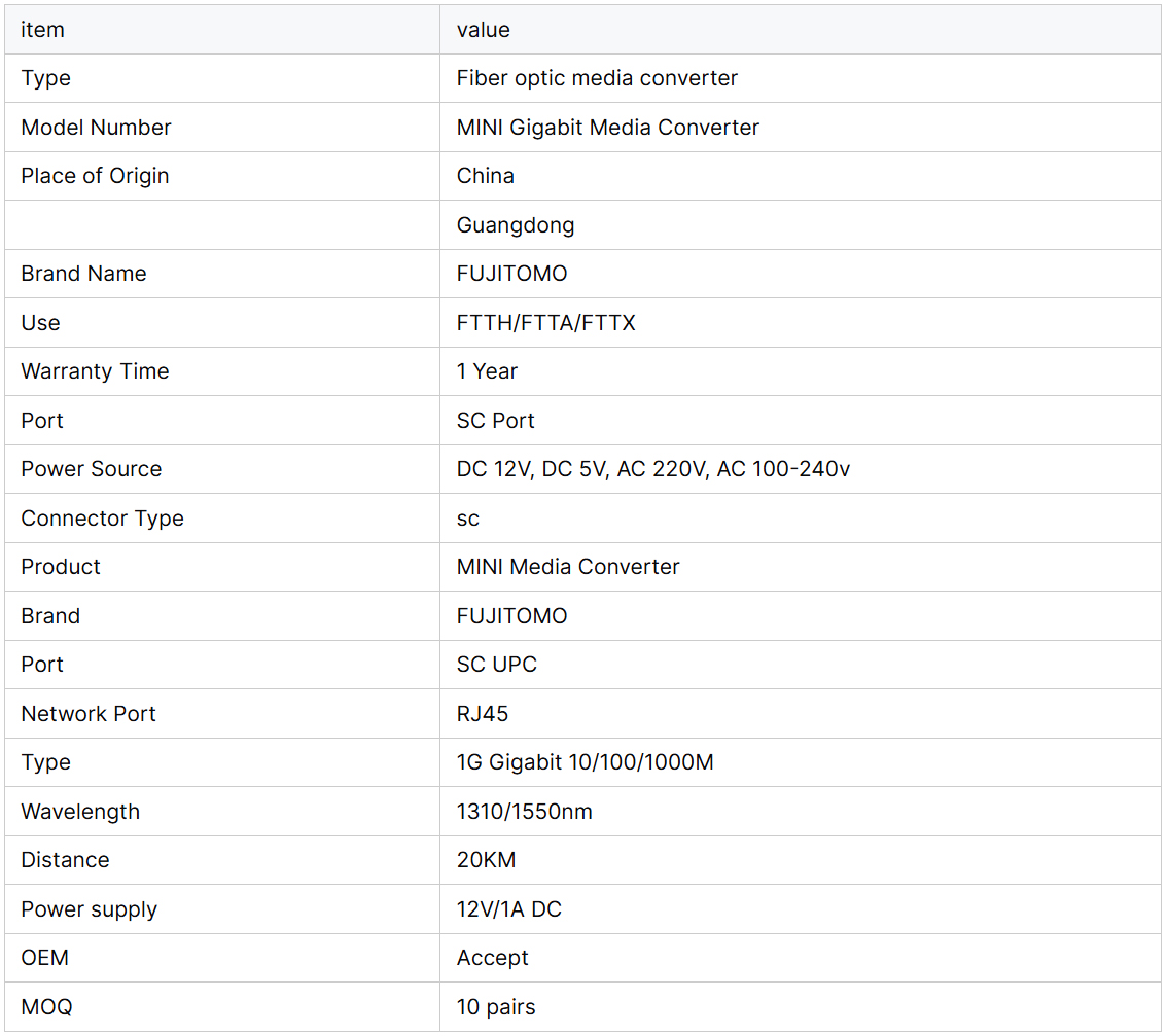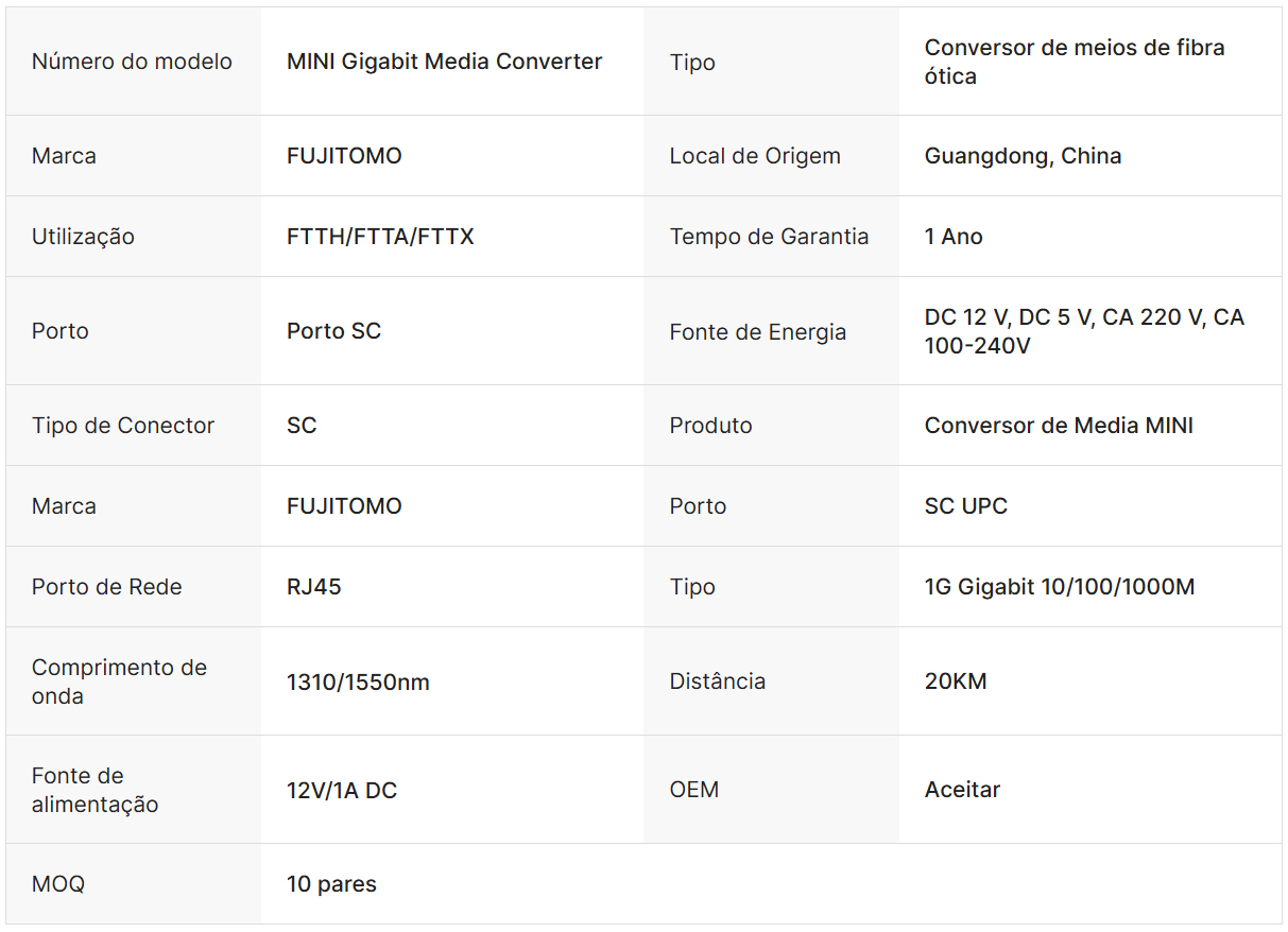 Destaques de longa-metragem: O FUJITOMO MINI Media Converter suporta Velocidades Gigabit de 1G com compatibilidade 10/100/1000M, com uma porta de fibra SC e Ethernet RJ45 para uma integração de rede versátil. Garante uma transmissão fiável de dados até 20 km e funciona com várias fontes de energia, incluindo AC 100-240V e DC 12V, oferecendo flexibilidade em vários ambientes.