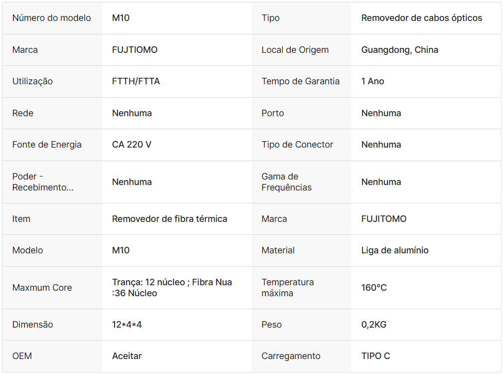 Destaques de longa-metragem: O Removedor de Fibra Térmica Elétrica FUJITOMO M10 foi concebido para desmontar eficientemente cabos de fibra ótica, apresentando um Capacidade máxima de núcleo de 12 rabos de cavalo e fibras nuas de 36 núcleos. Construído a partir de Liga de alumínio duradoura, garante um desempenho fiável com uma temperatura máxima de 160°C. O seu tamanho compacto de 12*4*4 e o design leve de 0,2KG tornam-no altamente portátil e fácil de manusear. O dispositivo suporta carregamento TYPE C e é ideal para aplicações FTTH/FTTA.