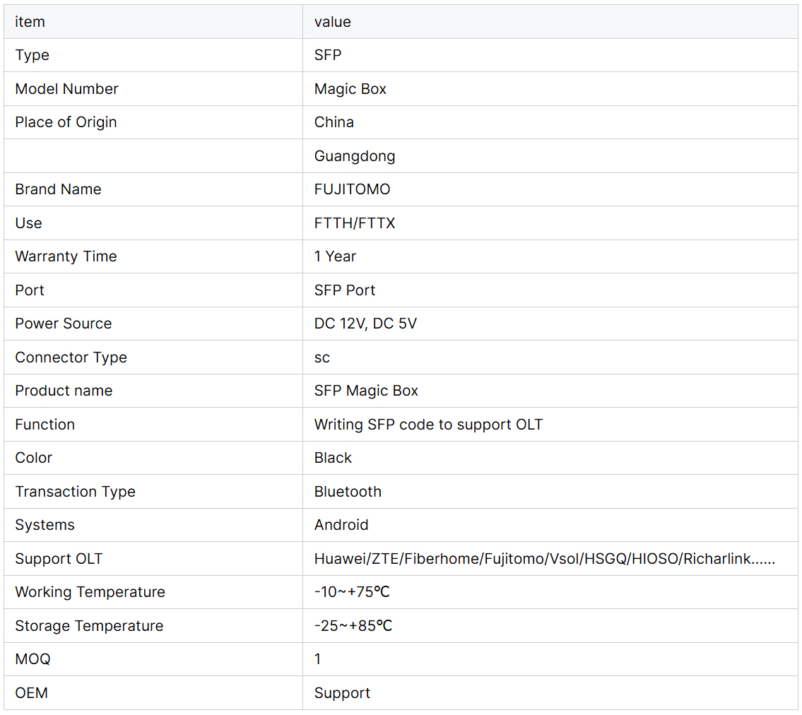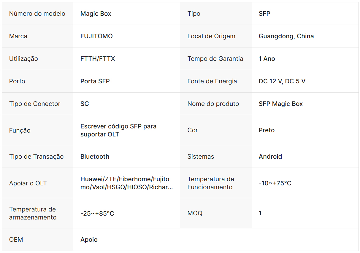 Destaques de longa-metragem: A Caixa Mágica Fujitomo para Escrita de Código de Módulos SFP suporta várias marcas OLT, incluindo Huawei e ZTE, e Fujitomo. Apresenta conectividade Bluetooth, compatibilidade com Android e uma gama de temperatura de -10~+75°C para desempenho fiável. Com uma fonte de alimentação DC de 12V e um tipo de conector SC, assegura uma escrita eficiente de código para módulos EPON, GPON e XGS-PON.