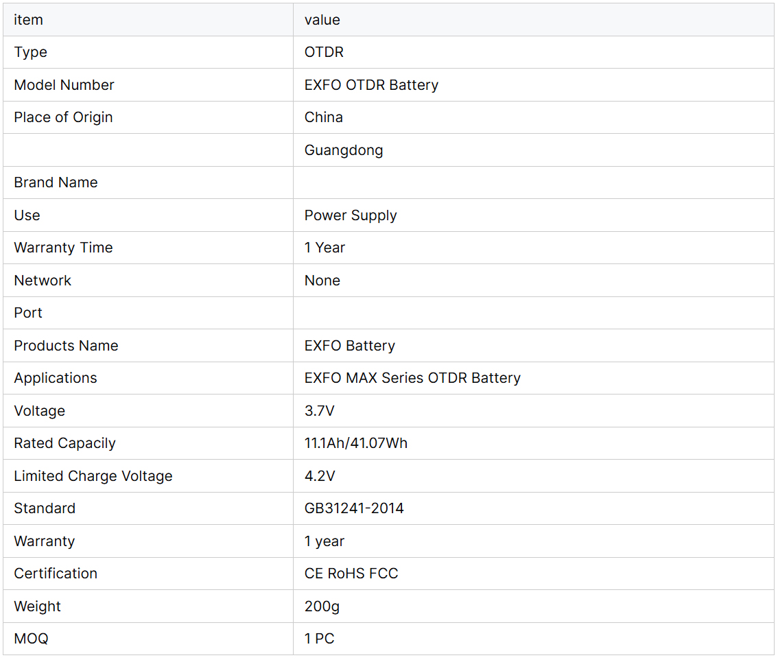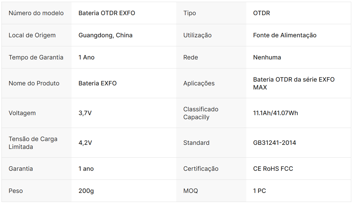 Destaques de longa-metragem: Bateria OTDR EXFO projetada para Série EXFO MAX, apresenta uma tensão de 3,7V, Capacidade nominal de 11,1Ah/41,07Wh, e cumpre as normas GB31241-2014. Garante um fornecimento de energia fiável e é compacto, com apenas 200g.