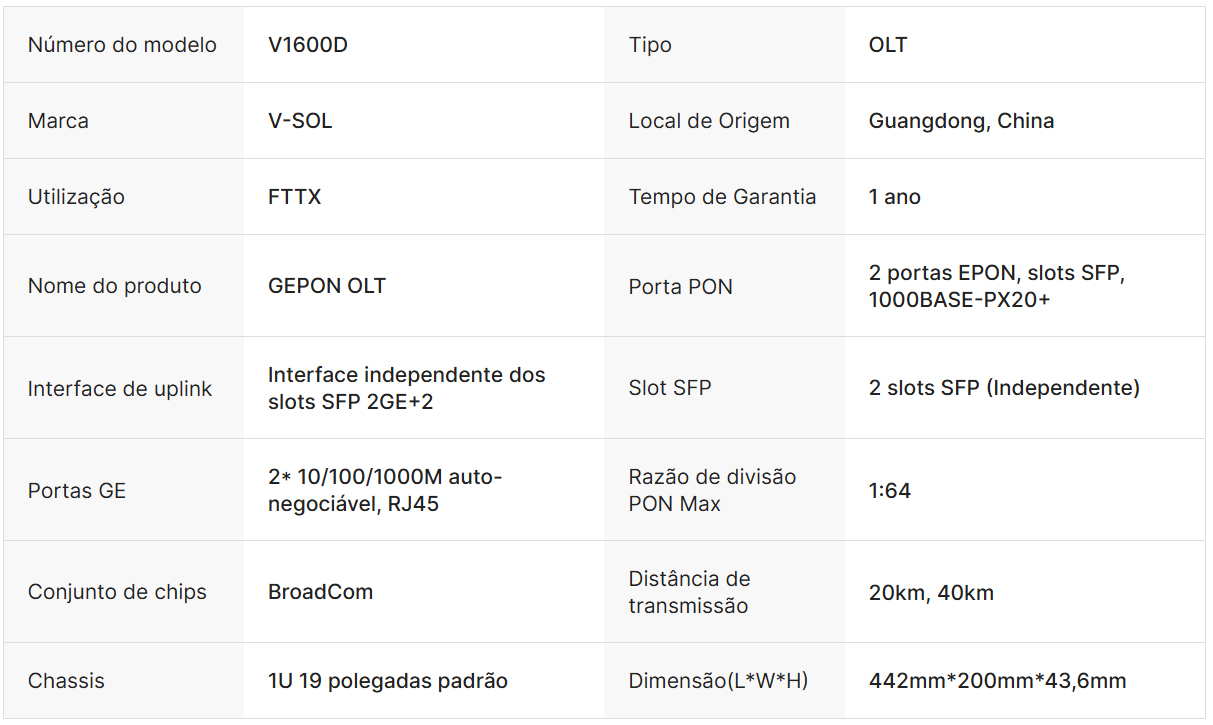 V-Sol OLT V1600D 2GE+2 slots SFP interface independente 2* 10/100/1000M Auto-negociável RJ45 Equipamento de Rede de Fibra
