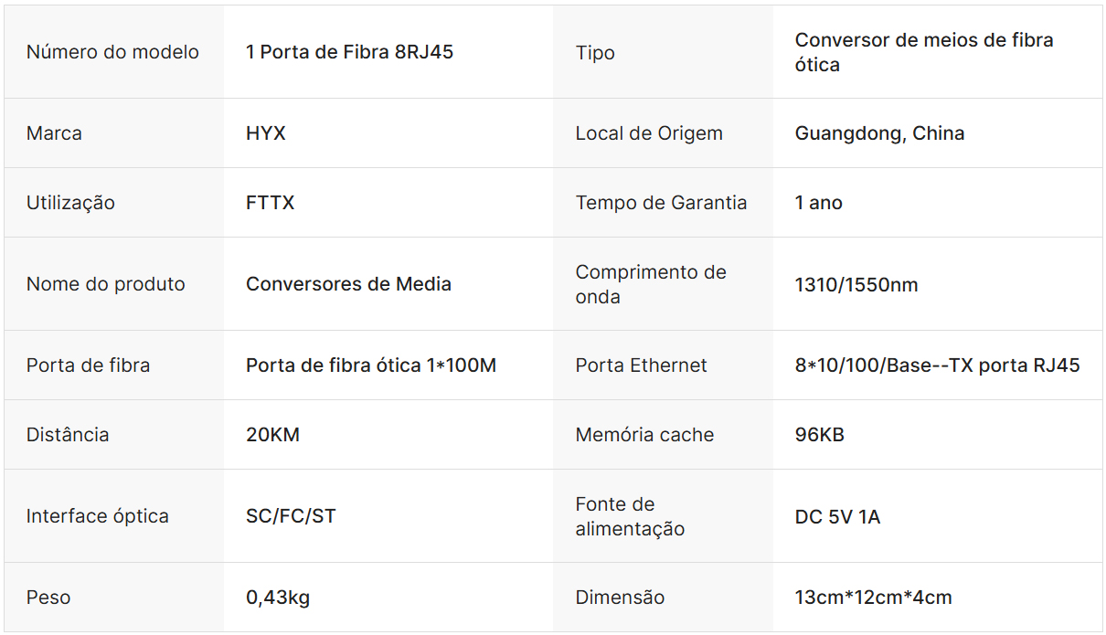 Conversor de Media Fibra 10/100Mbps 1 Fibra Óptica SC 8RJ45 Portas LAN Switch Ethernet Câmara ótica Conversor de Media