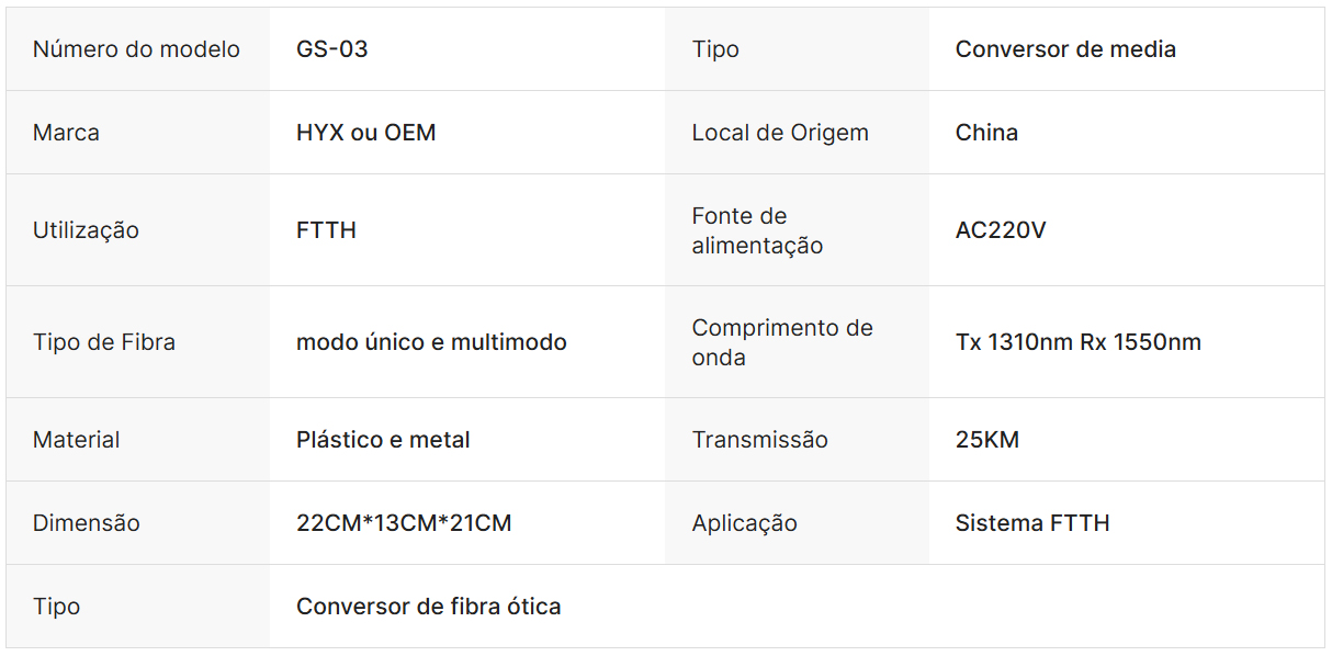 A função de negociação automática equipada permite que os conversores de media operem a Ethernet de cobre ou Fast Ethernet de 10 ou 100Mbps e fibra de 100Mbps. Esta conversão cumpre os padrões IEEE802.3 e IEEE802.3u com dois meios de ligação de rede diferentes, 10/100Base-TX e 100Base-FX. A transmissão de dados é realizada através de tecnologias de comutação e armazenar e encaminhar.