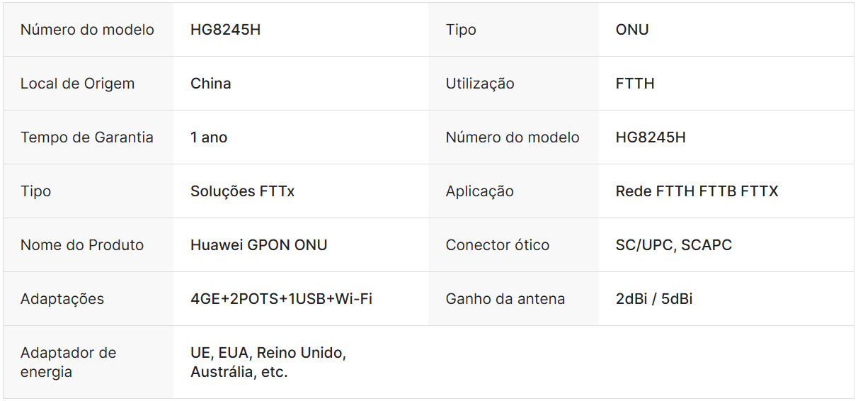 Destaques de longa-metragem:Huawei HG8245H GPON ONU suporta redes FTTH com 4GE, 2POTS e portas Wi-Fi, apresentando uma interface PON classe B+/PX20+ e Tx 1310nm, comprimento de onda Rx 1490nm. Inclui portas Ethernet adaptativas, suporte a antenas externas e ampla compatibilidade com adaptadores de alimentação para uso global.