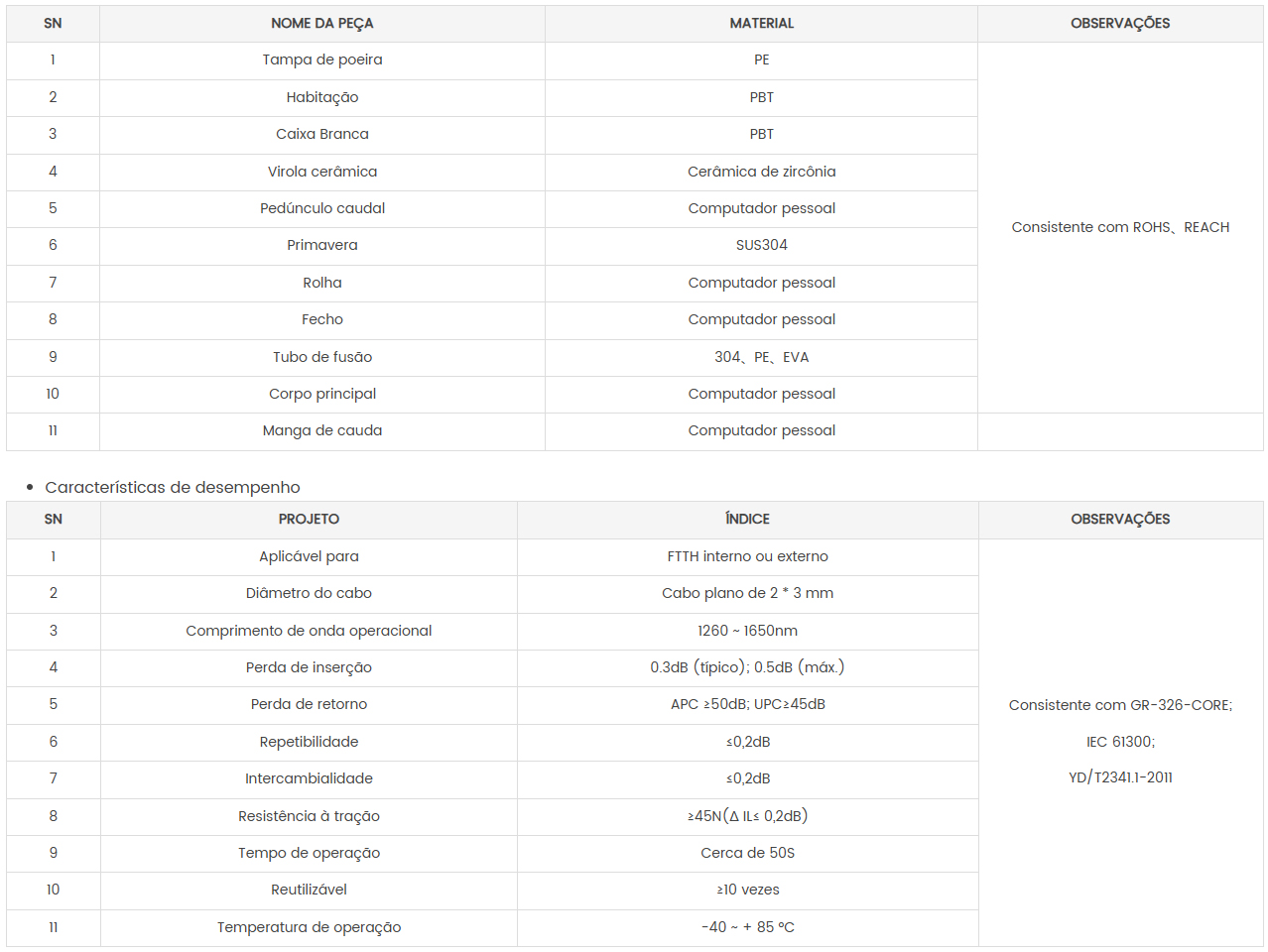 Single-Mode FTTH Fibra Hot Melt Conexão Rápida SC APC FTTH Fibra Conector Rápido Conversor de Conector SCT ecificações técnicas de S: