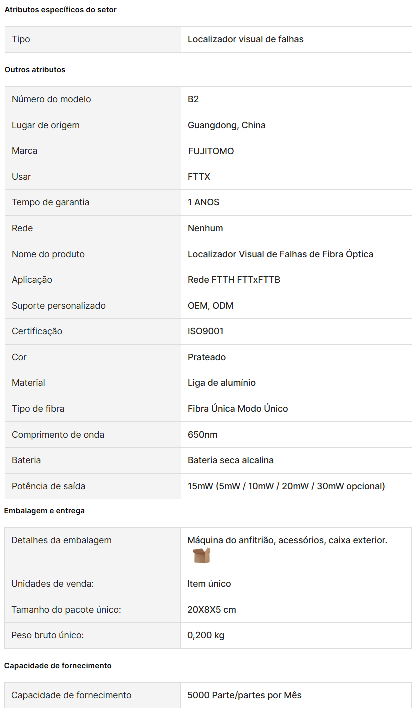 Localizador visual de falhas de alta qualidade: Este produto é um localizador visual de falhas confiável e de alta qualidade projetado para uso em redes FTTH, FTTX e FTTHB. Possui uma construção durável em liga de alumínio e uma bateria alcalina seca de longa duração.