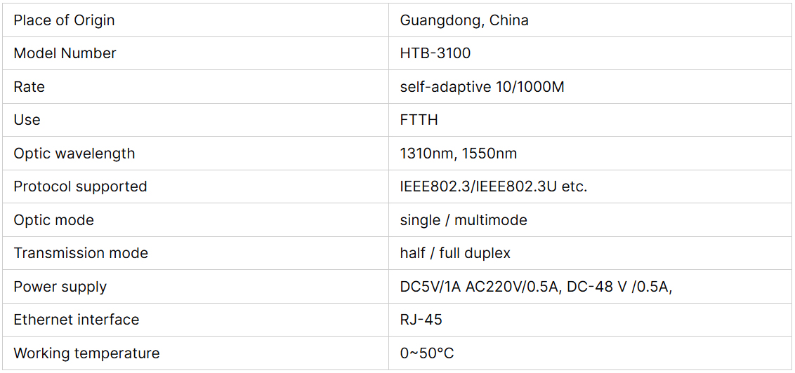 Оснащённая функция автоматического согласования позволяет медиа-преобразователям работать на медном Ethernet или Fast Ethernet со скоростью 10 или 100 Мбит/с, а также с оптоволокном 100 Мбит/с. Это преобразование соответствует стандартам IEEE802.3 и IEEE802.3u с двумя разными сетевыми медиа подключения: 10/100Base -TX и 100Base-FX. Передача данных осуществляется с помощью коммутационных и технологий хранения и пересылки.