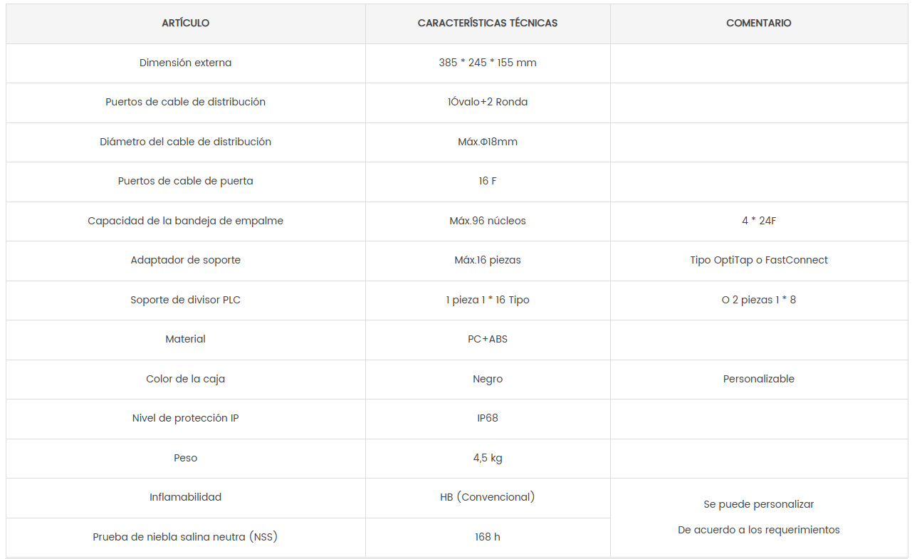 El cierre de terminación de acceso de fibra puede contener hasta 16 suscriptores y 60 puntos de empalme como cierre. Se utiliza como cierre de empalme y punto de terminación para que el cable de alimentación se conecte con el cable de bajada en el sistema de red FTTx. Integra el empalme de fibra, la división, la distribución, el almacenamiento y las conexiones de cables en una caja de protección sólida.