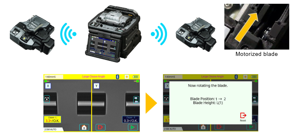 La empalmadora por fusión y la cortadora de fibra CT52/58 tienen conectividad de datos inalámbrica. Esta capacidad permite la rotación automática de la cuchilla cuando el empalmador juzga que la cuchilla está desgastada.