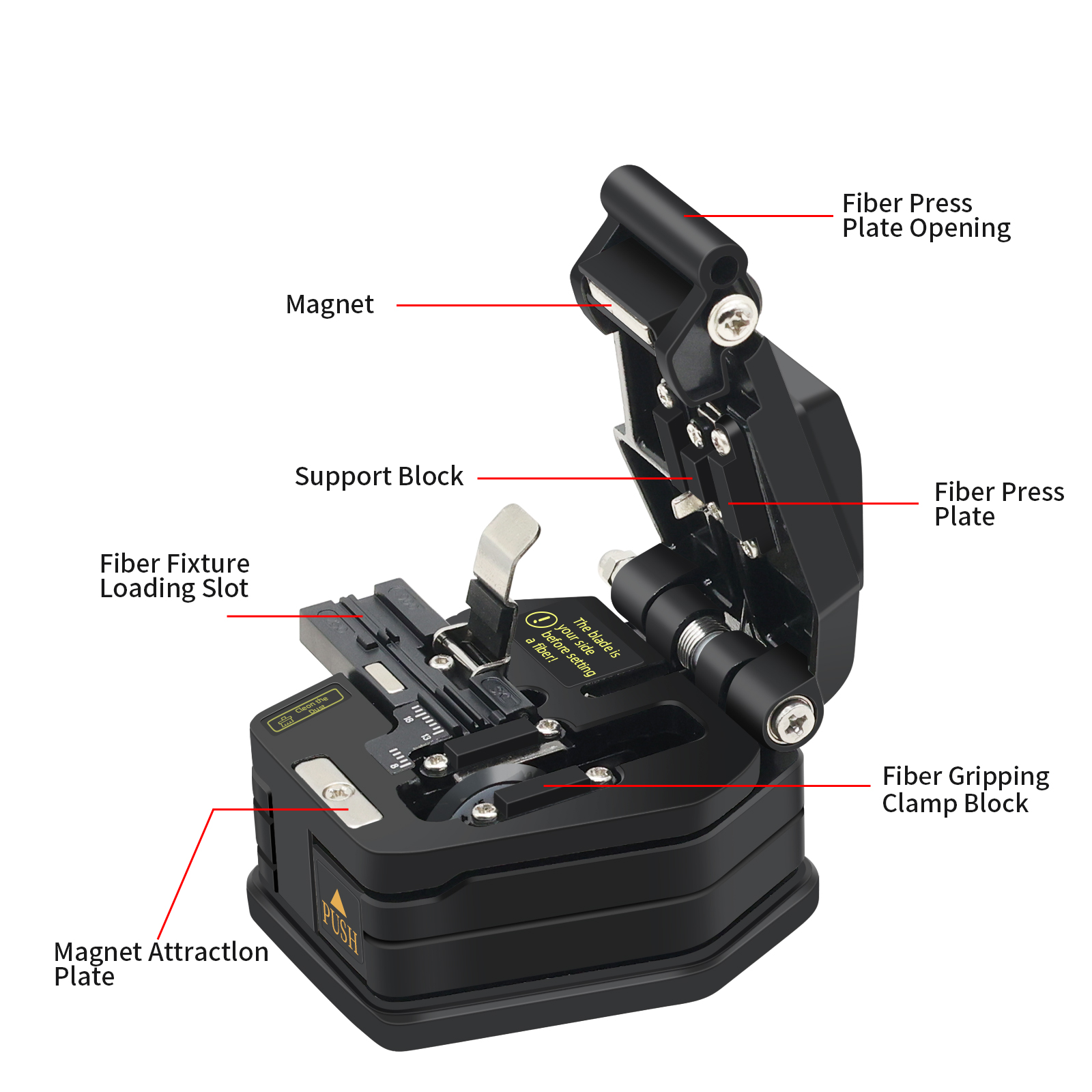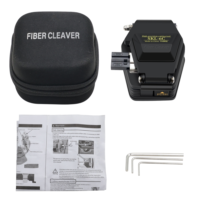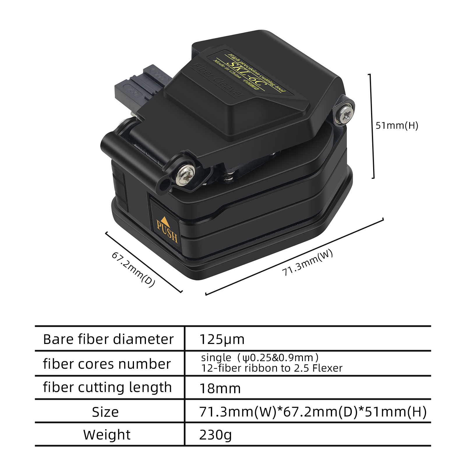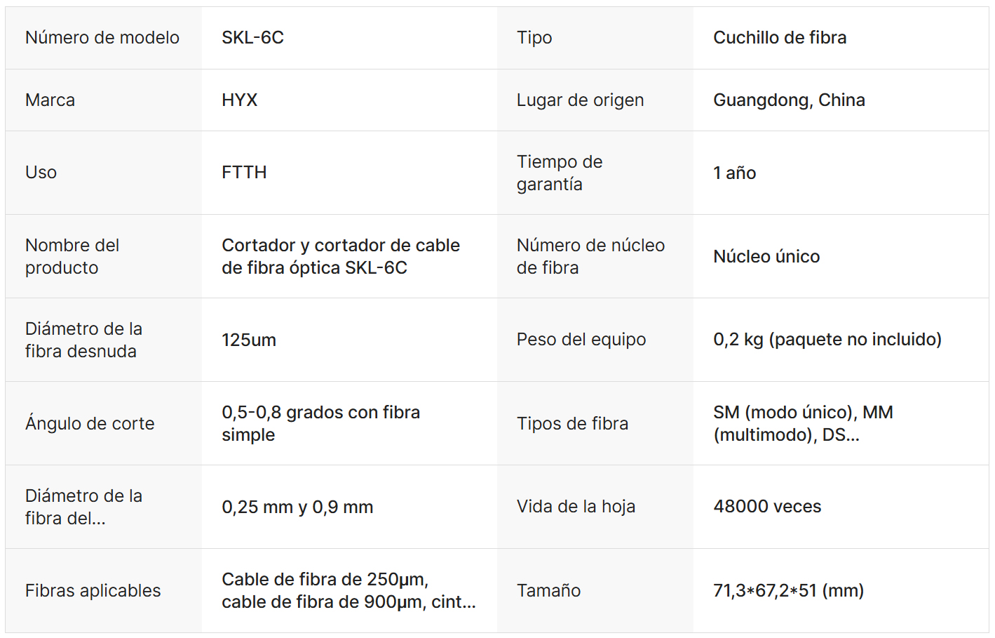 Es un cortador de fibra óptica multiusos, el producto utiliza los 16 puntos de corte y tiene una vida útil más larga. El cuchillo SKL-6C de Alta Precisión se instala con soporte 3 en 1 aplicable a fibra de 250 μm