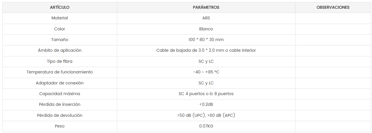 Este tipo de caja de roseta de fibra puede contener hasta 4 suscriptores. Se utiliza como punto de terminación para que el cable de bajada se conecte con el cable de conexión en la aplicación interior FTTH. Integra