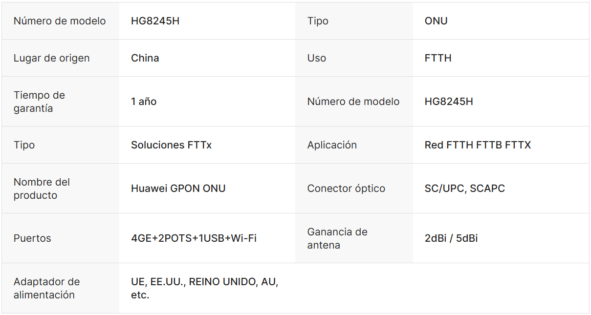 Aspectos destacados:Huawei HG8245H GPON ONU soporta redes FTTH con 4GE, 2POTS y puertos Wi-Fi, con una interfaz PON clase B+/PX20+ y Tx de 1310nm, longitud de onda Rx 1490nm. Incluye puertos Ethernet adaptativos, soporte para antenas externas y amplia compatibilidad con adaptadores de alimentación para uso global.