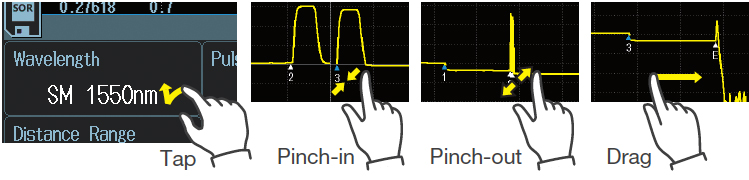 Toque, deslice el dedo, pellizque o presione con la pantalla multitáctil intuitiva y receptiva. Esta pantalla táctil capacitiva multitáctil de 5,0 pulgadas de alta resolución y capacidad de respuesta, combinada con botones de teclas rígidas, hace que las operaciones con OTDR sean sencillas e intuitivas.
