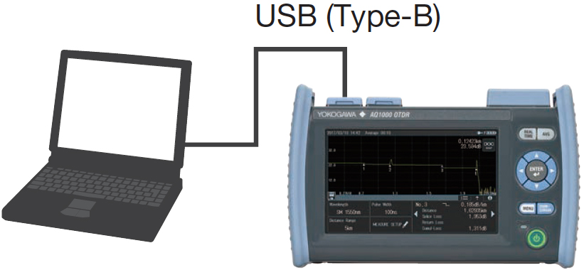 Los archivos de datos del AQ1000 se pueden transferir a un smartphone o tableta mediante el transportador de datos OTDR, o a un PC mediante el software del control remoto OTDR.
