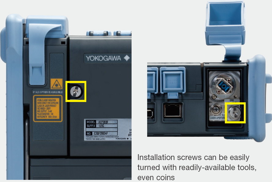 El hardware de las unidades OTDR, los módulos opcionales y la tapa de la batería se puede quitar y volver a colocar con herramientas de trabajo comunes, incluso monedas, para permitir reemplazos y ajustes rápidos y fáciles incluso cuando se está en el campo.