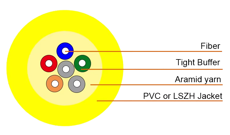 El cable óptico de tampón apretado de distribución utiliza fibra de tampón apretado de 2 ~ 24 núcleos y 900 μm como medio de comunicación óptica.