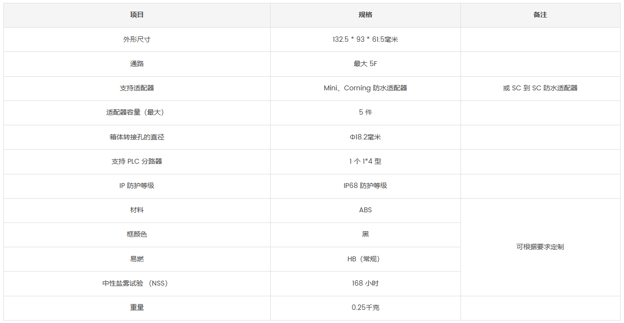 这用作馈线电缆与 FTTx 通信网络系统中的引入电缆连接的终端点。光纤分路和分配可以在这个盒子里完成,同时为 FTTx 网络建设提供了坚实的保护和管理。