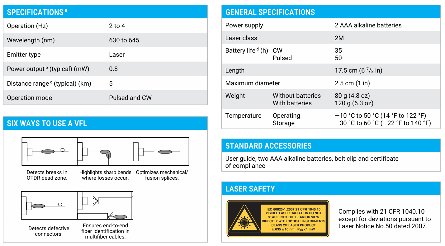 * 可以进行端到端识别的典型连续光纤长度。VFL 取决于测试现场的环境光线条件。