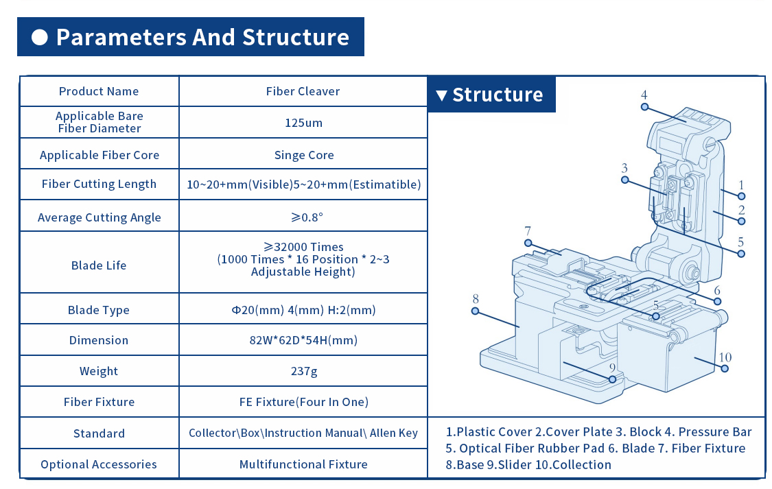 光纤跳线。具有自动刀背滑功能,只需将盖子放回和纤维推入即可完成所有切割工作。