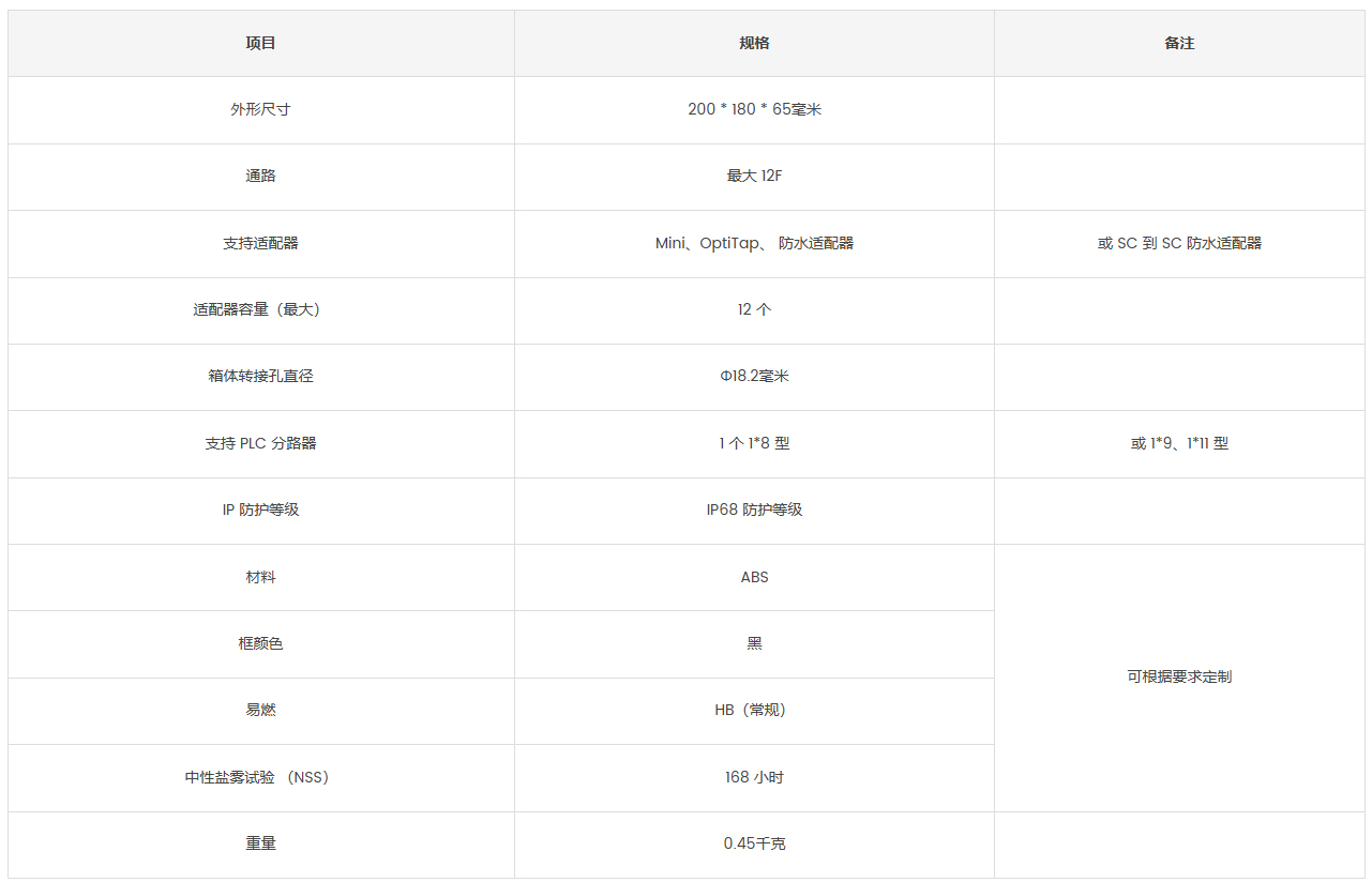 预连接光纤分线箱 12 芯黑色 ABS 保护带防水适配器特点:
