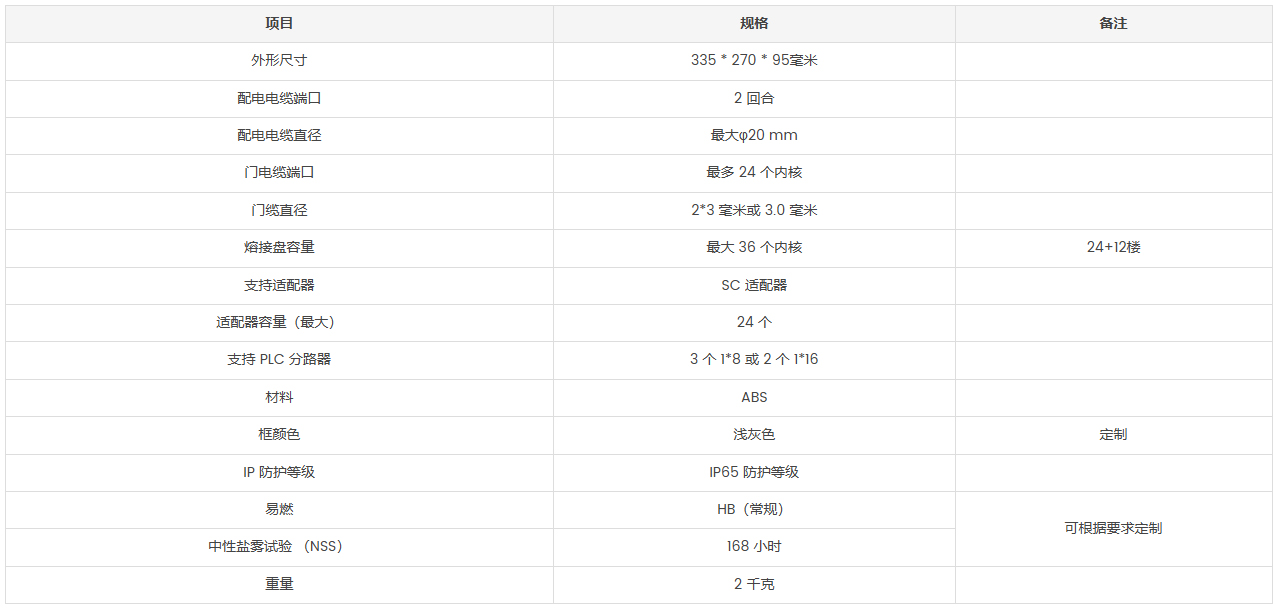 该设备用作馈线电缆的终端点,与 FTTx 通信网络系统中的引入电缆连接。光纤拼接、分路、分配都可以在这个盒子里完成,同时为 FTTx 网络建设提供坚实的保护和管理。