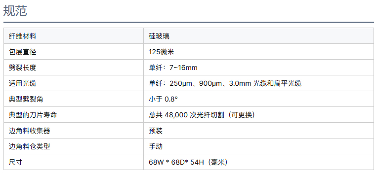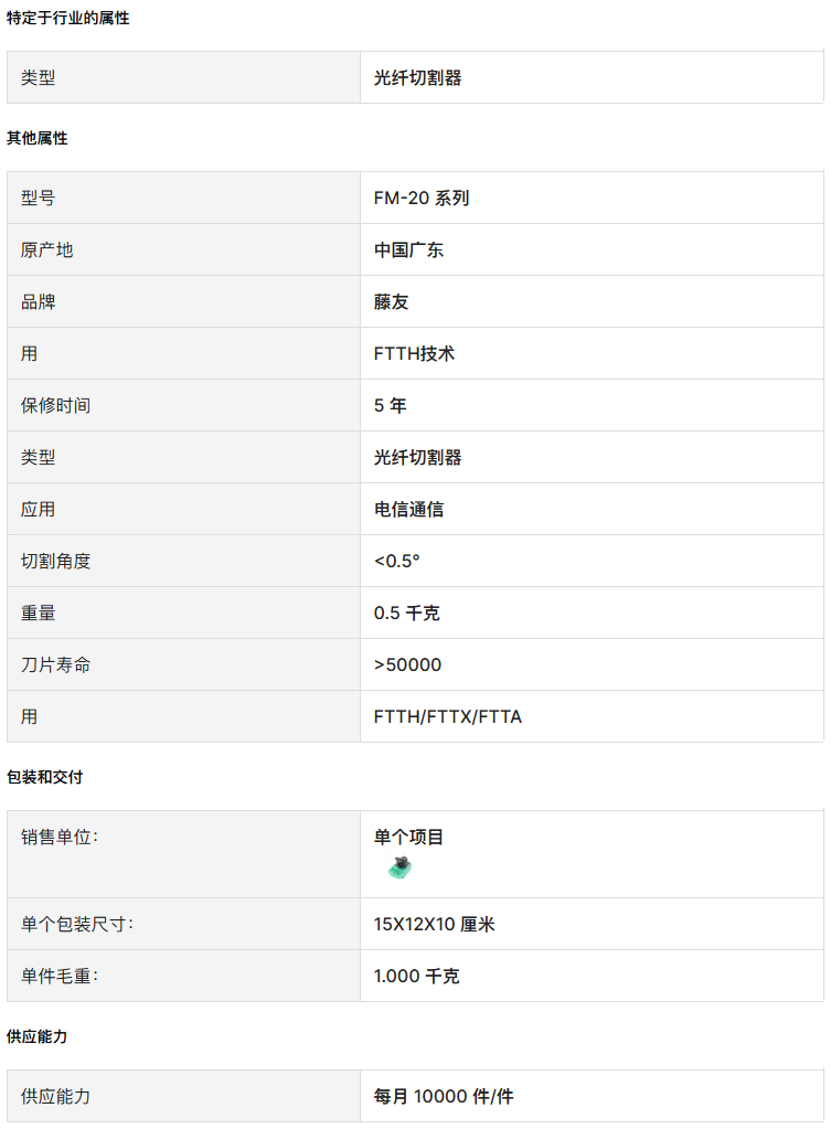 Fujitomo FM-20 光纤切割机采用高精度数控加工,耐腐蚀性强,稳定性好;刀片采用真钨钢制成,技术先进,硬度高,使刀刃极其锋利;切割角度 ≤0.8 度用于平滑切割光纤的端面。同时,刀片的使用寿命可达 48000 次,经久耐用。